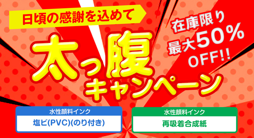 なんと、太っ腹キャンペーンでは、水性顔料インクの塩ビ(PVC)(のり付き)再吸着合成紙最大50%OFFと大幅値下げ致します!!